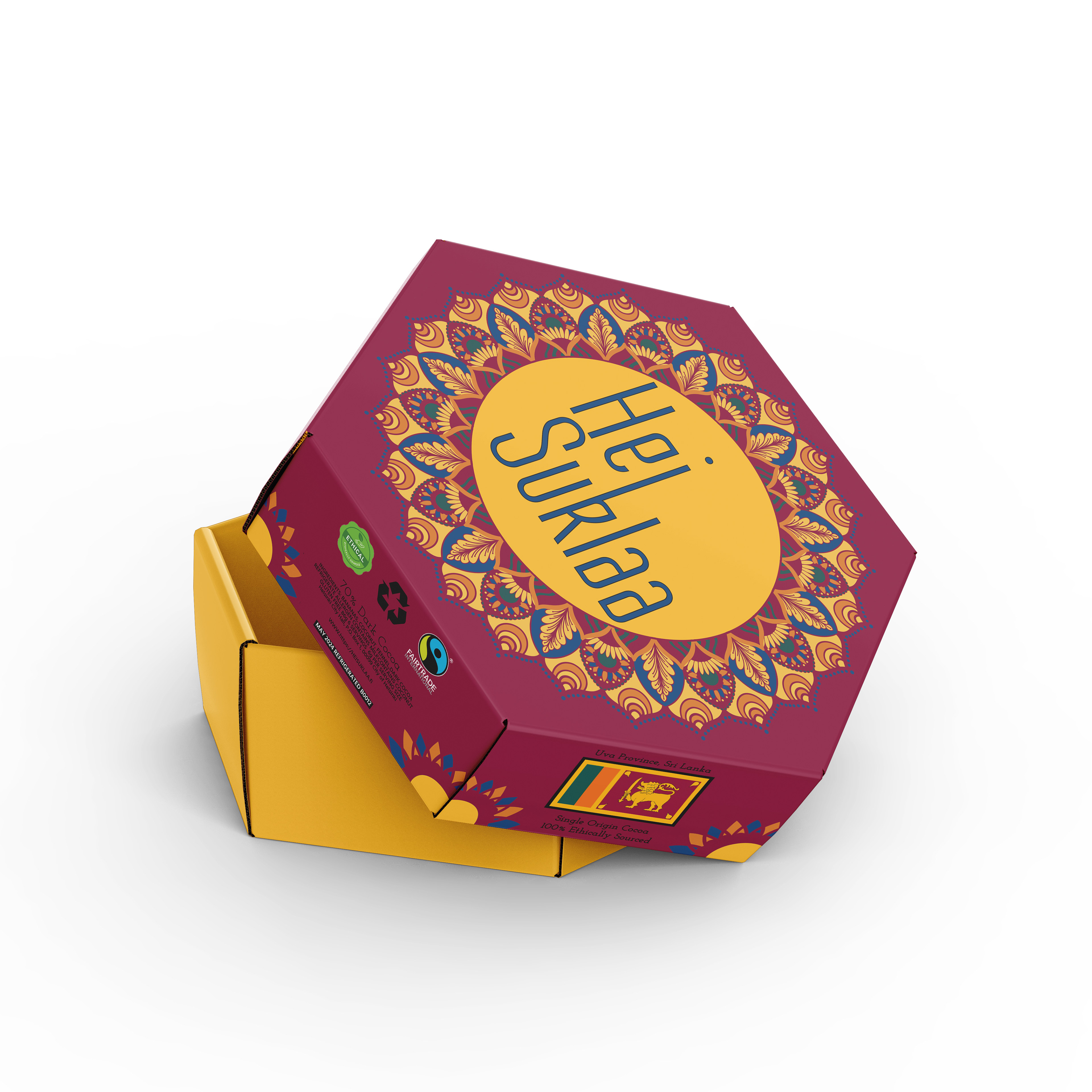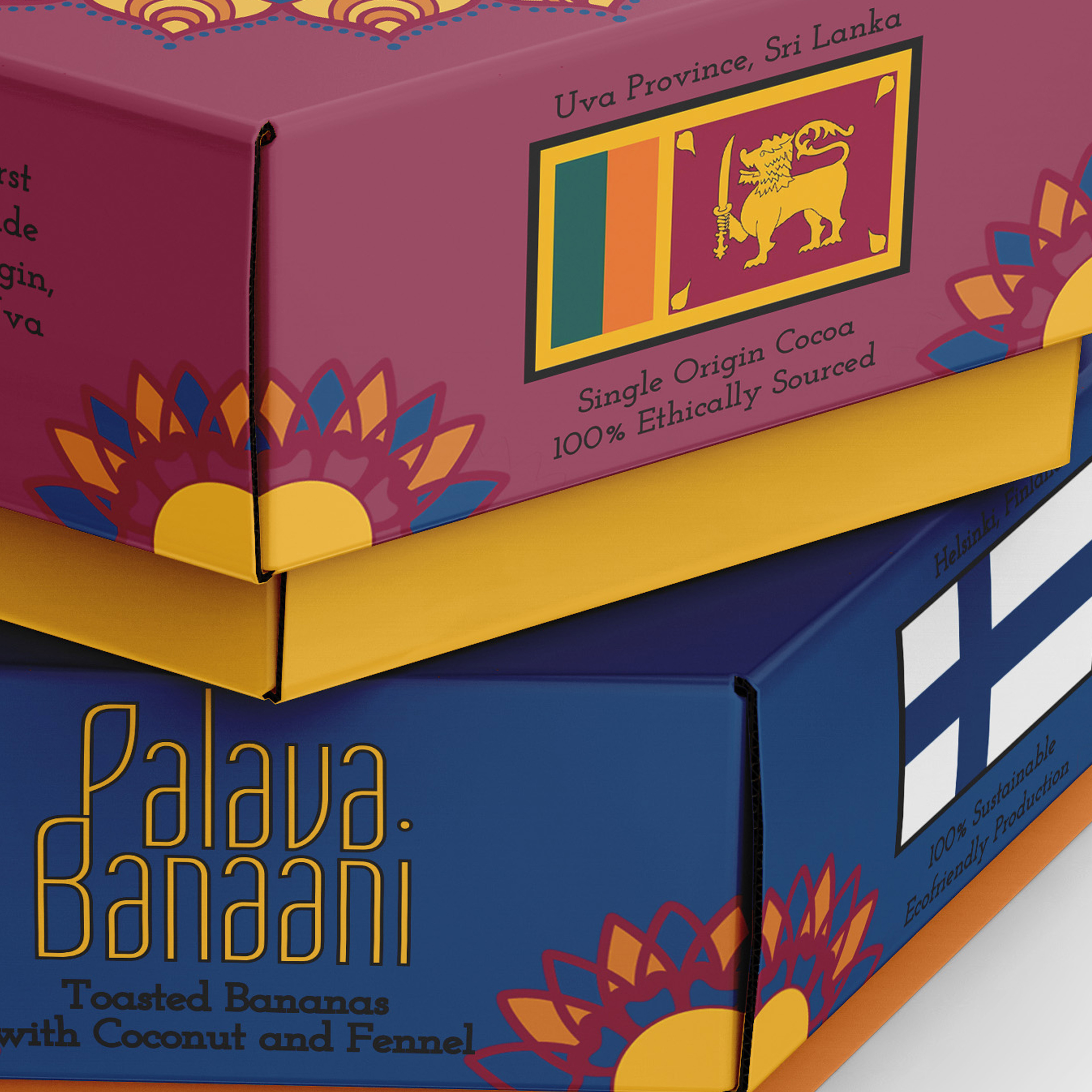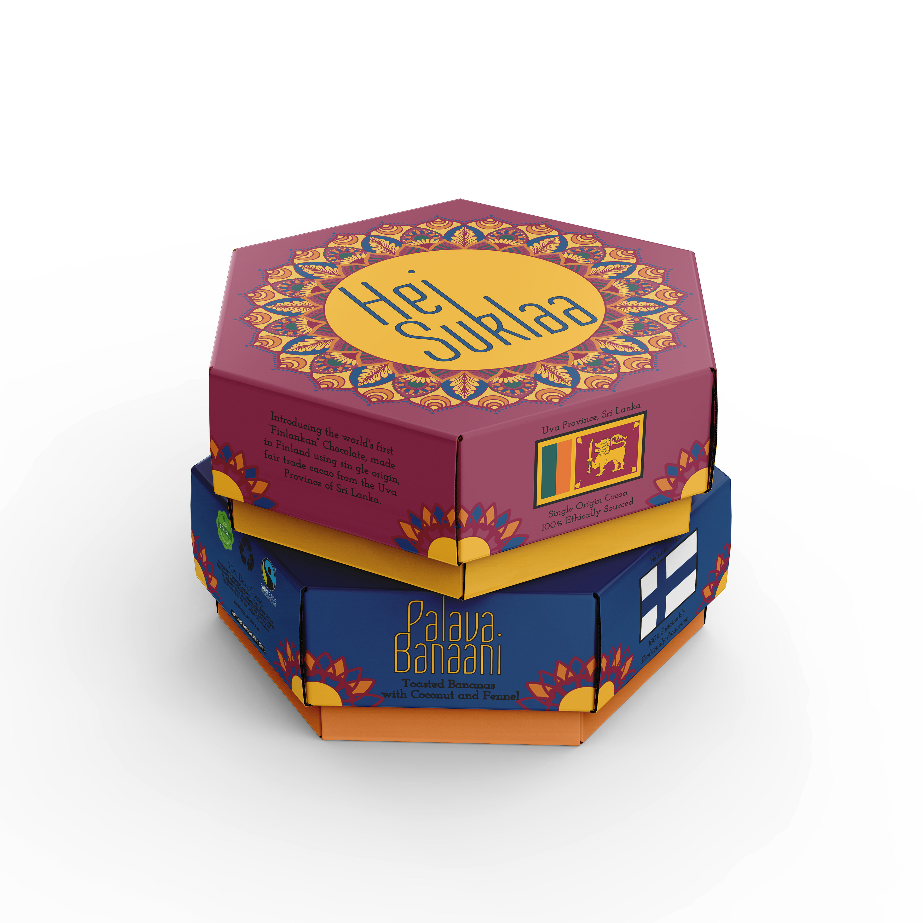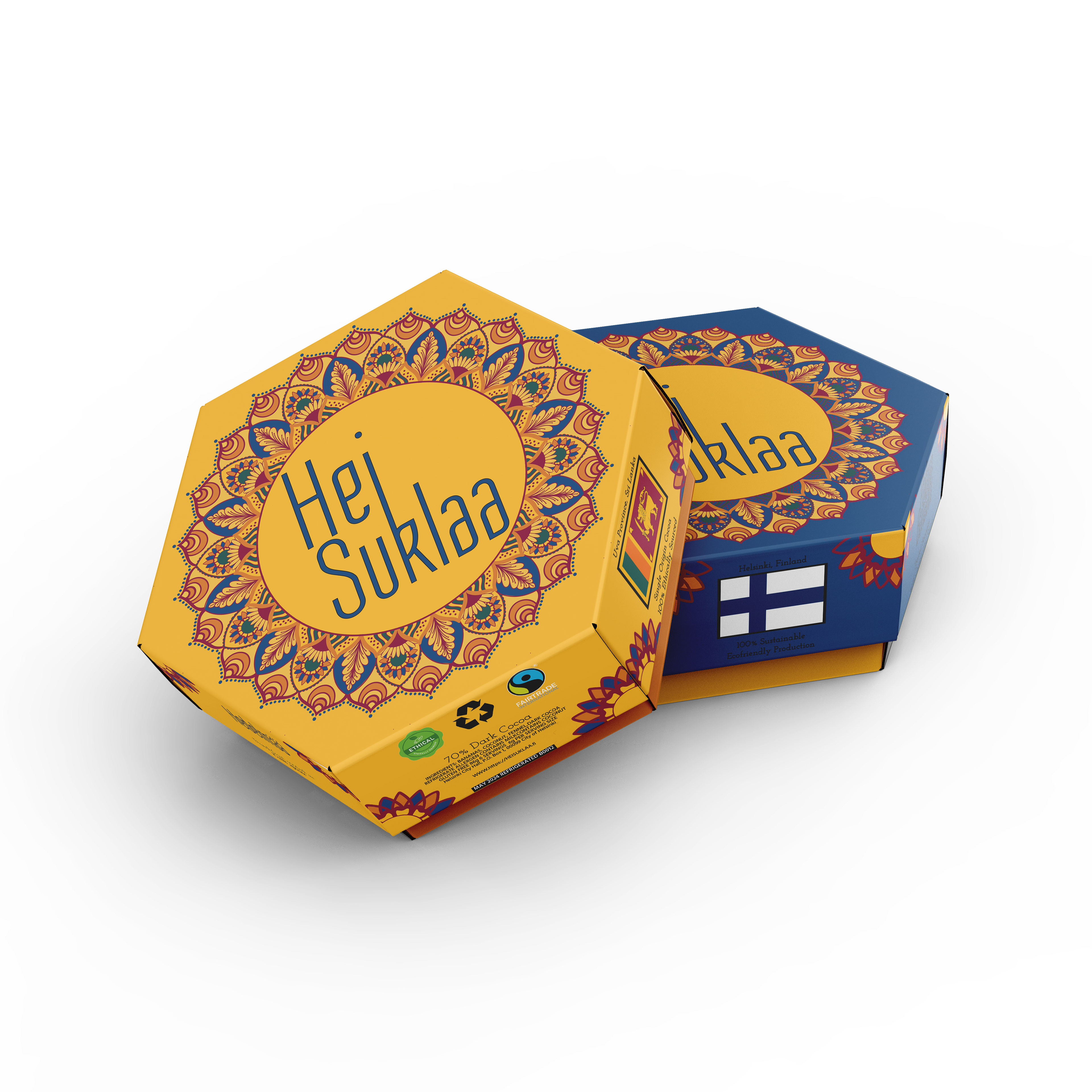 For this project, I designed packaging for Hei Suklaa, a theoretically sustainable chocolate company that bridges the cultures of Finland and Sri Lanka. My goal was to create a seamless brand identity by incorporating elements of both countries’ languages and artistic traditions. The design appeals to travelers, specialty chocolate lovers, and curious consumers looking for a unique and culturally rich experience. Through a balance of sustainability, craftsmanship, and global connection, Hei Suklaa invites customers to indulge in chocolate with a story.